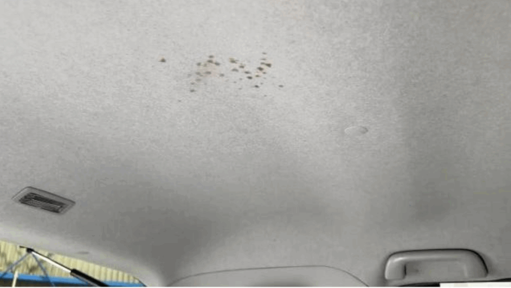 上を見上げると、天井のルーフライニングにも飛び散り跡があり、お子様が乗車中に飲み物をこぼしてしまったような形跡も。